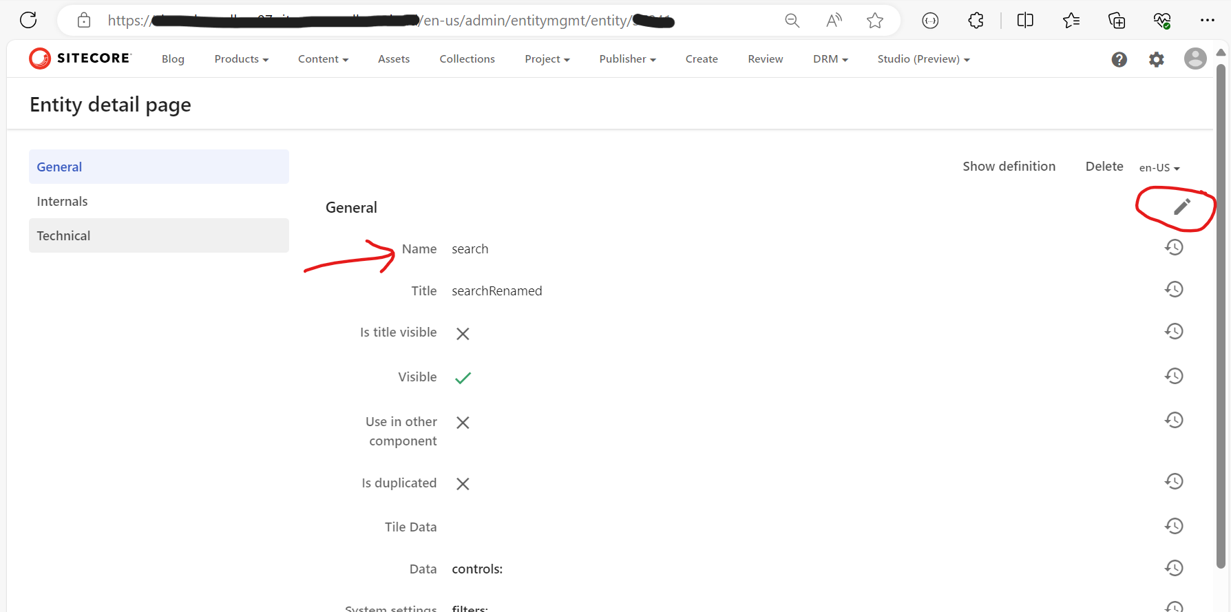 - Or, use the Entity Management page to rename the Name of the second Search component to make it unique, as shown below. You will need to know the Entity Id of your second Search component.