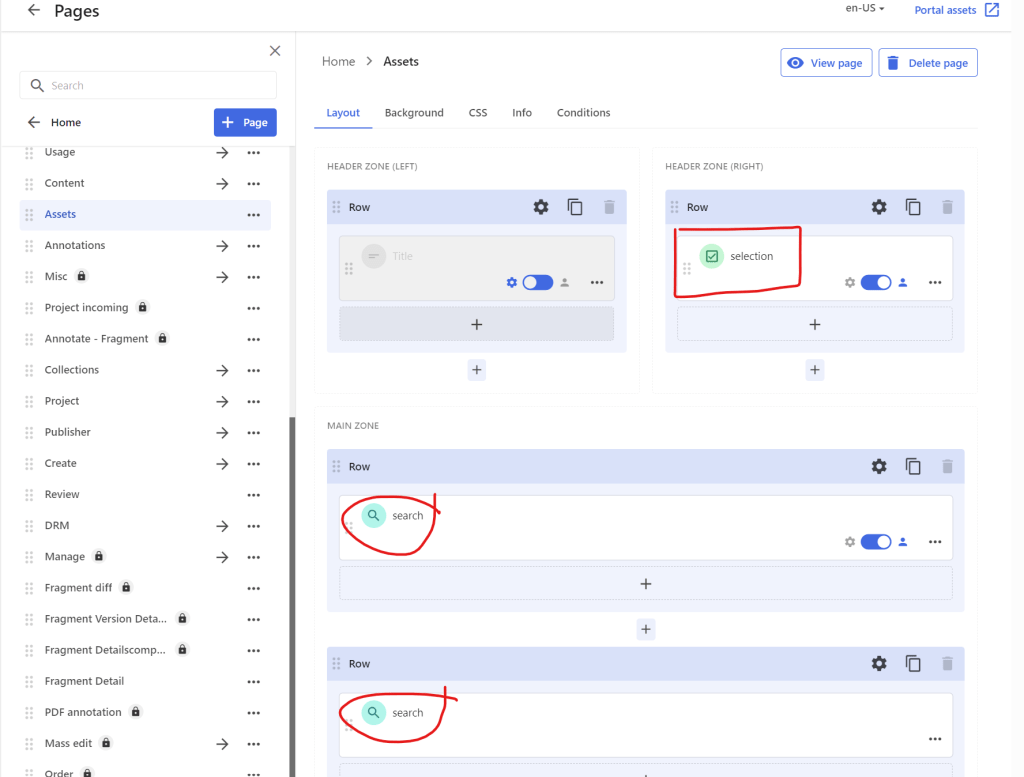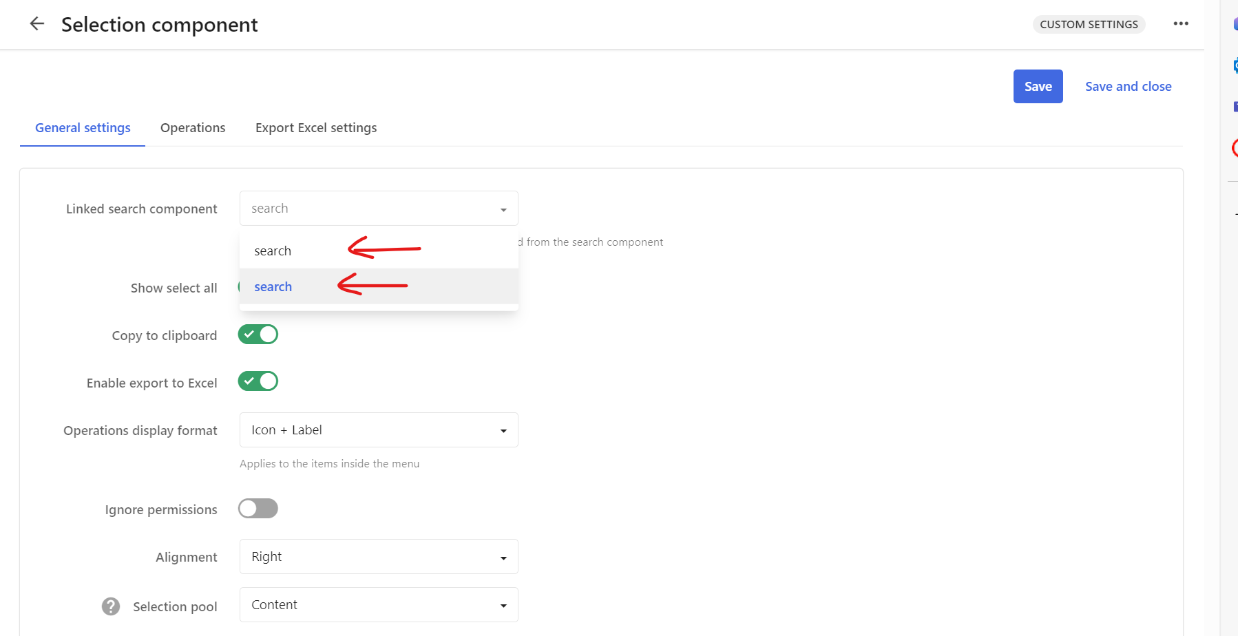 Consider the scenario as per the screenshot above. You are configuring a second Search component on your Assets search page. You make a genuine mistake and name your second Search component identical with your existing one, as shown. In this case, you would like to link your second Search component with your existing Selection component as shown.