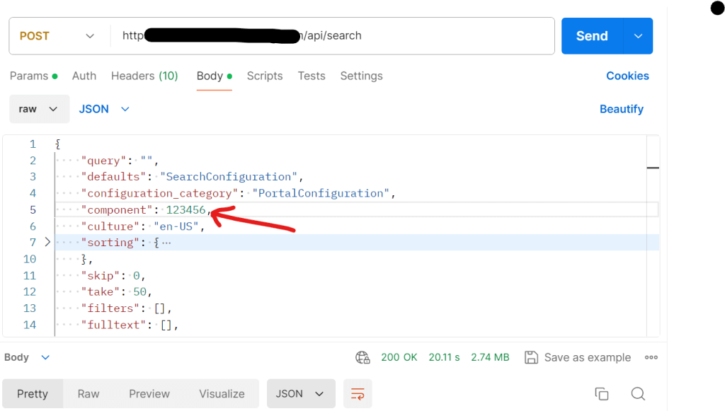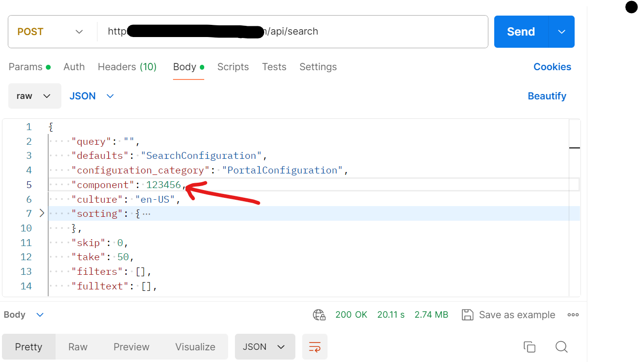 Below is an example of a POST request, indicating the search component Id within the request body. Of course you will also need to specify the required X-Auth-Token header to authenticate your request. (I am assuming you know how to go about this, and I have skipped these details)