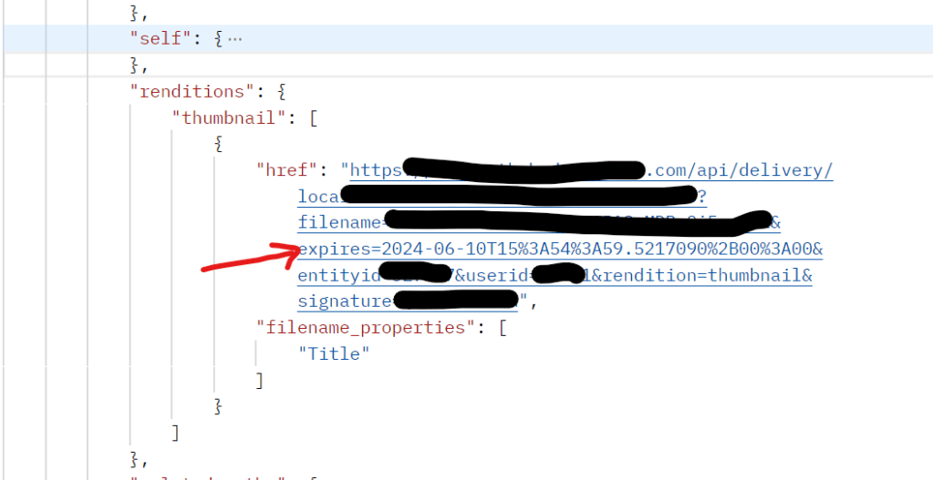 The response that you receive from Search API will contain a list of your assets that meet the search criteria. Each item in the response will contain the asset metadata details defined in your search component. In addition, you will get Thumbnail delivery link for the asset. This is particularly of interest for me, as the default expiry time is set to 20 minutes and is not enough for my current scenario. Below is a snippet of such response, indicating the thumbnail delivery link. Notice the expires url param indicated.