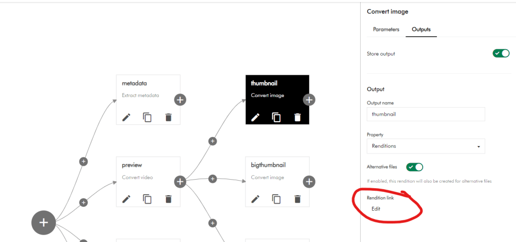 - Open Manage -> Media Processing -> Images -> thumbnail task -> Outputs tab -> the “Edit” Rendition link button