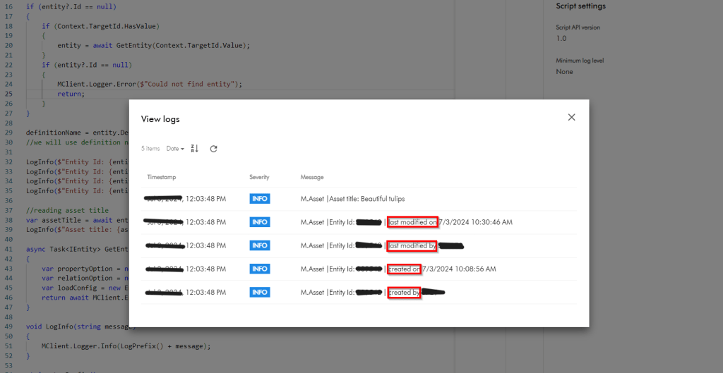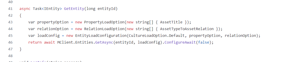 You should be familiar on how to load an entity property, by leveraging the PropertyLoadOption in your EntityLoadConfiguration, as shown above. That is how I am able to retrieve the Username property from the current user entity (currently authenticated user within Content Hub). This will be the user that has triggered our Action Script.