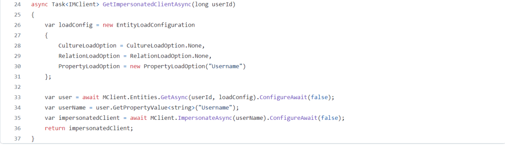 Good news, I have already defined such a function for you. I have named this function GetImpersonatedClientAsync, a shown below.