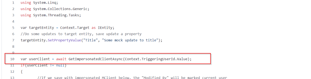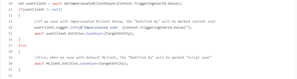 We now need to use the impersonated MClient in all instances where we are saving changes in our Action Script. Below is a code snippet on how to achieve this. You can see on line 15, I am using the impersonated userClient. You can easily compare this with line 20, which is a fallback option that uses default MClient.