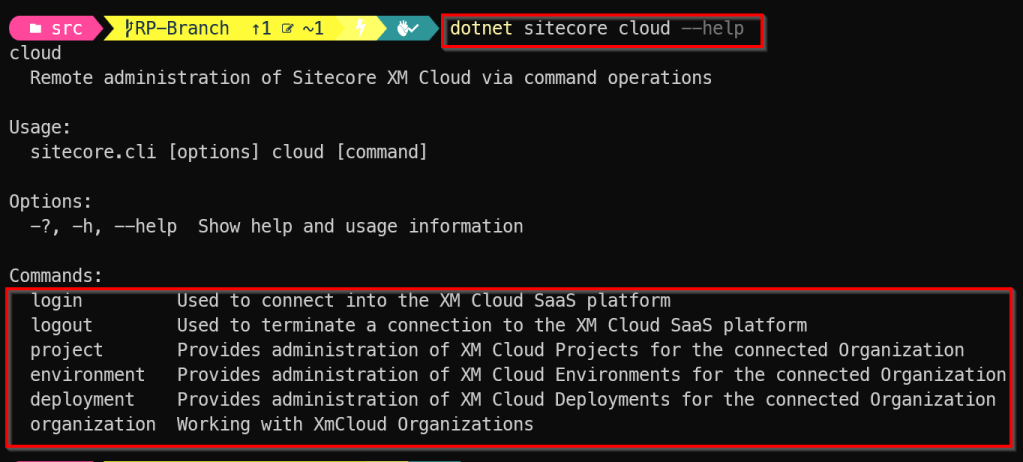 A CLI plugin typically consists of a command which has one or more subcommands. Using an example of Sitecore XM Cloud plugin, you can check the cloud command is available as shown below:
