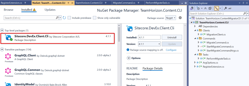 We need to reference the Sitecore.DevEx.Client.Cli NuGet package from Sitecore, as shown below.