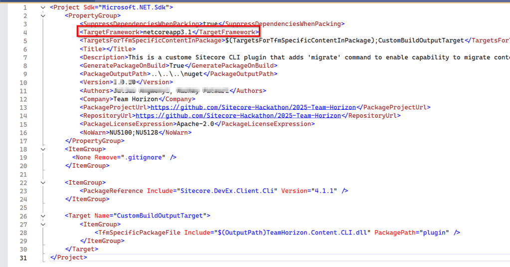 To ensure no errors with your CLI Plugin, you can verify your project file looks similar to the one shown below. Especially with Target Framework of netcoreapp3.1