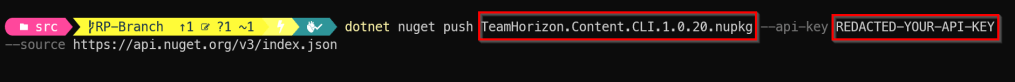 With our API-Key at hand, use the following command to publish your CLI Plugin. Notice we need to specify the name of our .nupkg file as well as API-Key when using the dotnet nuget push command.