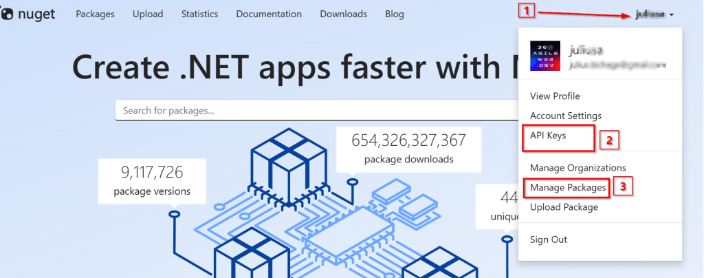 Head over to Nuget.org and register for an account. You will need a Microsoft account to sign in or sign up. On successful login, select your user name at upper right, and then select API Keys as shown in step 1 and step 2 in screenshot below