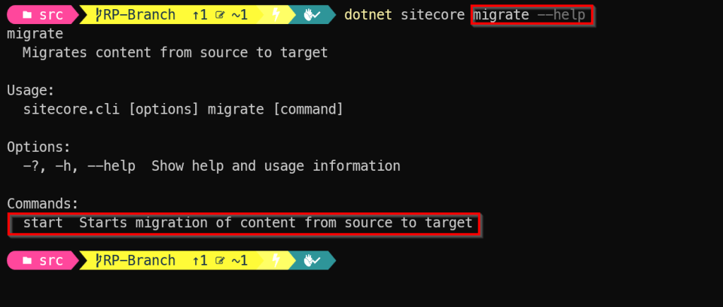 And we can now explore the available subcommands for our custom plugin using dotnet sitecore migrate --help command as shown below.