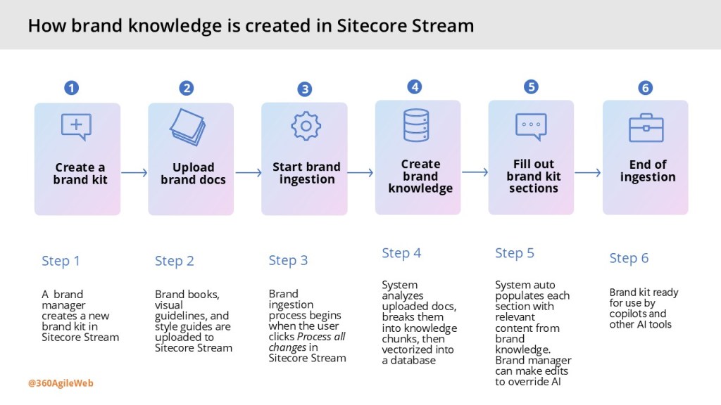 This involves a 6-step process as outlined in the infographic shown below. If you are managing a multi-brand enterprise, you can repeat this process for each of your separate brands. Essentially creating multiple brand kits within Sitecore Stream.