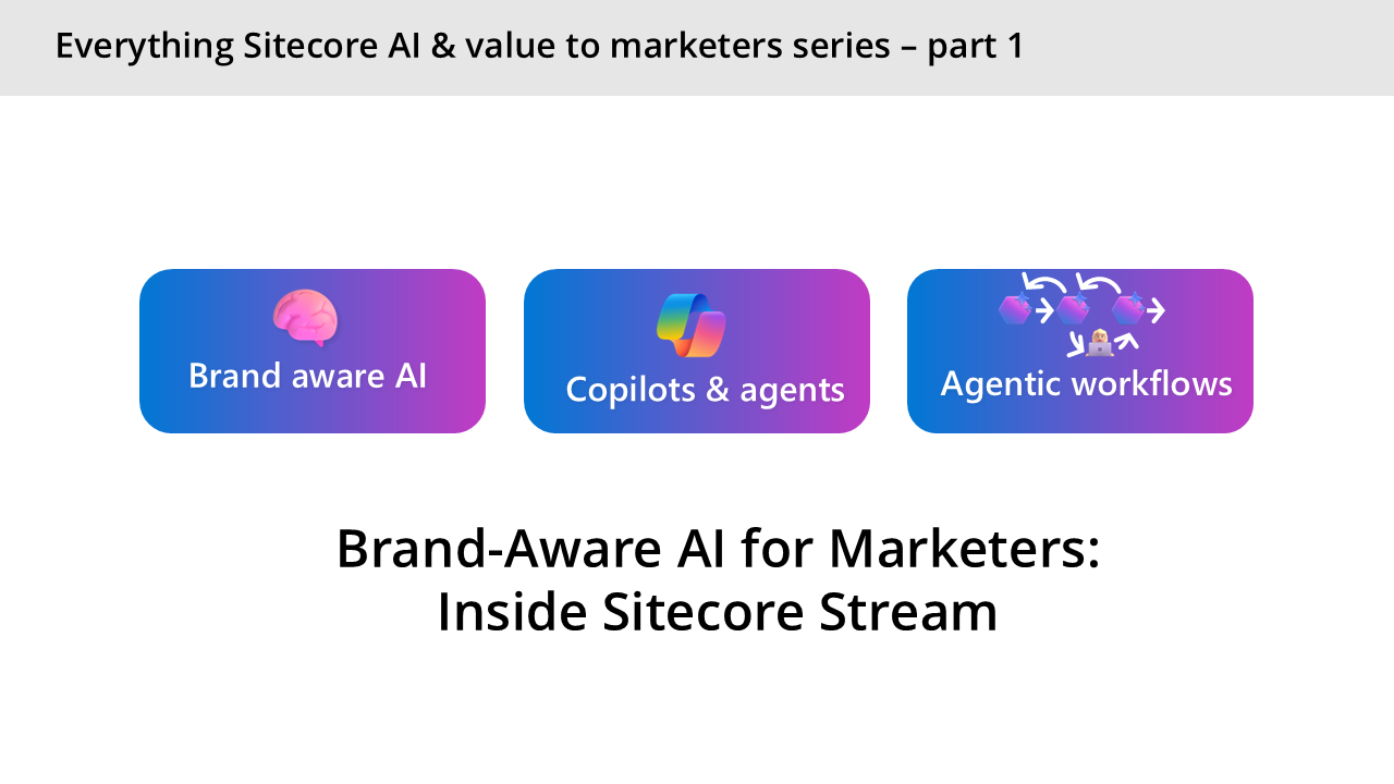 Sitecore Stream consists of three components: Brand-aware AI, Copilots & agents and Agentic workflows, as discussed below.