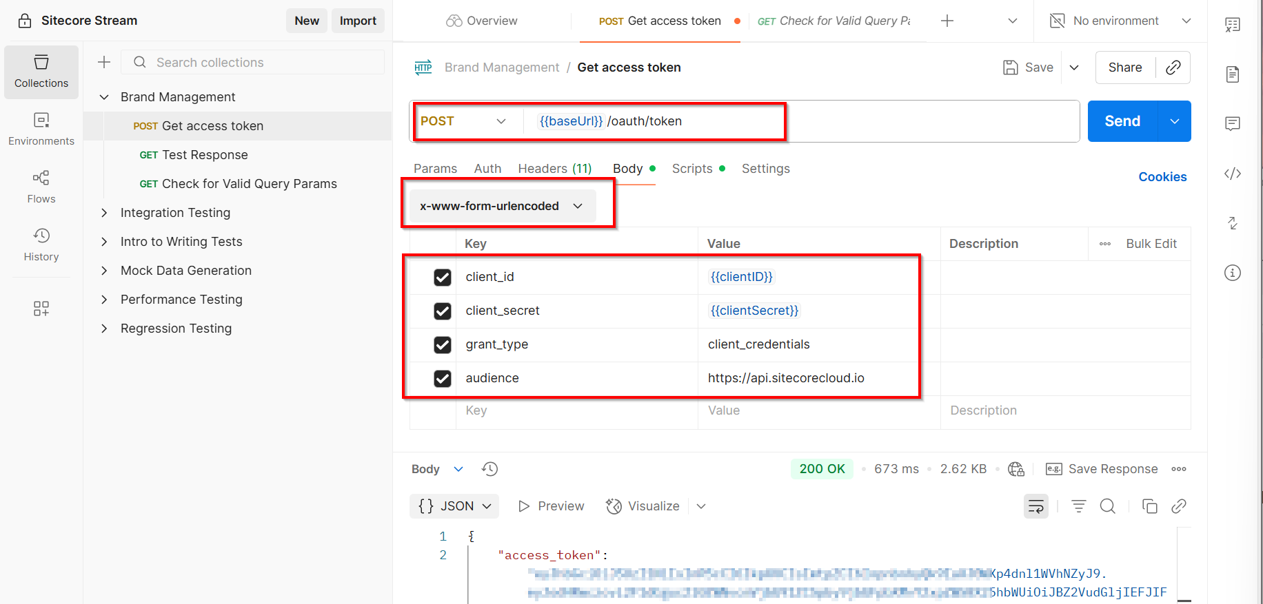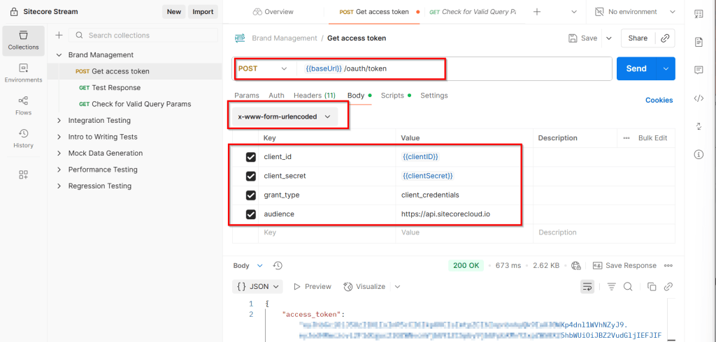 You can use your preferred tool to a request the access token. In the sample below, I am leveraging Postman to send a POST request to the https://auth.sitecorecloud.io/oauth/token endpoint.