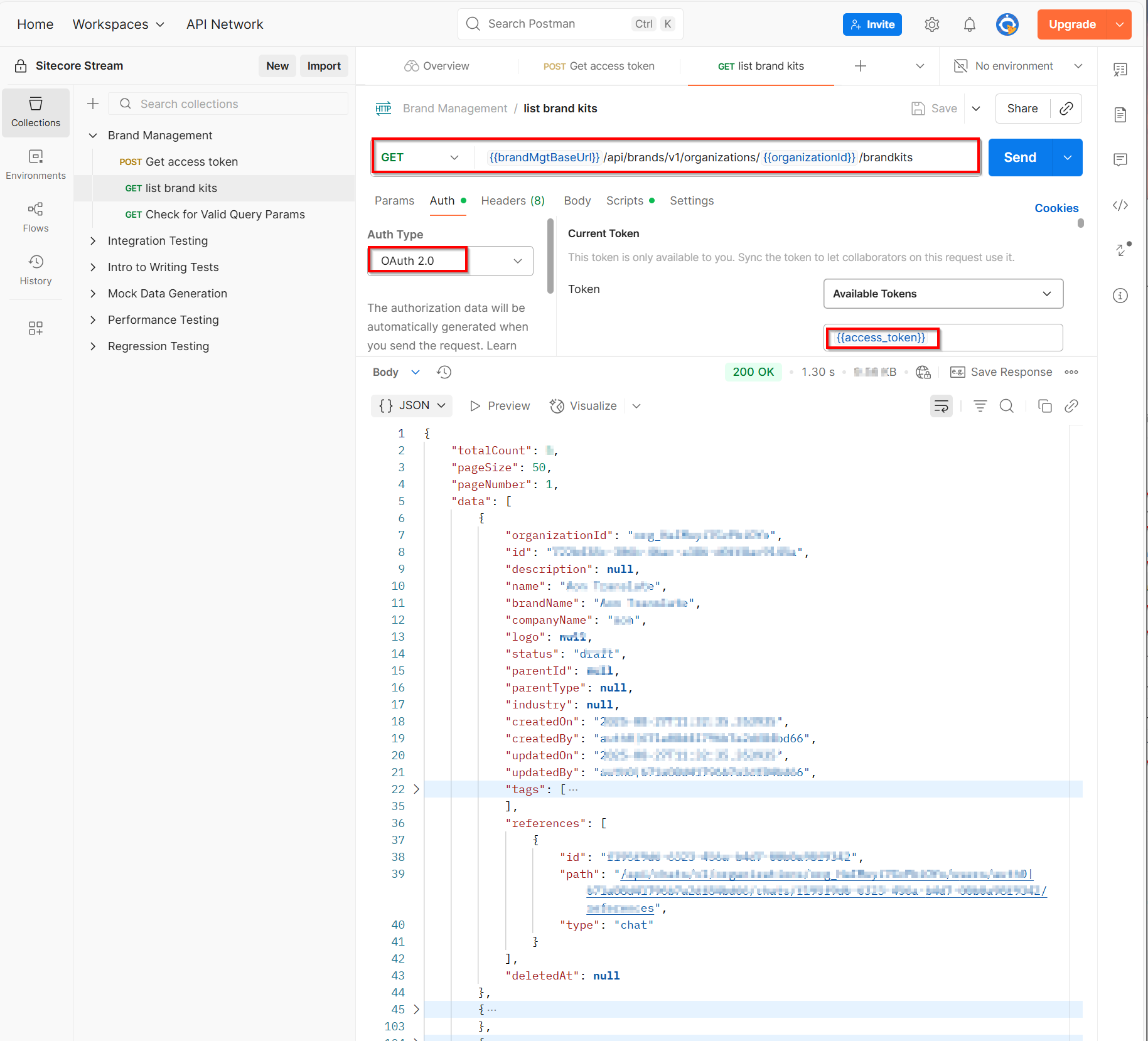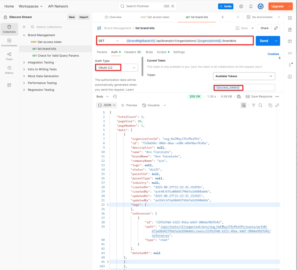 Below is a sample request that I used to get a list of available brand kits for my organisation. I am leveraging Postman to send a GET request to the https://ai-brands-api-euw.sitecorecloud.io/api/brands/v1/organizations/{{organizationId}}/brandkits endpoint.