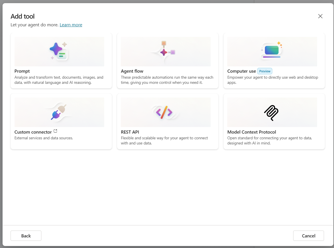 • Select New tool then choose Model Context Protocol. The MCP onboarding wizard opens