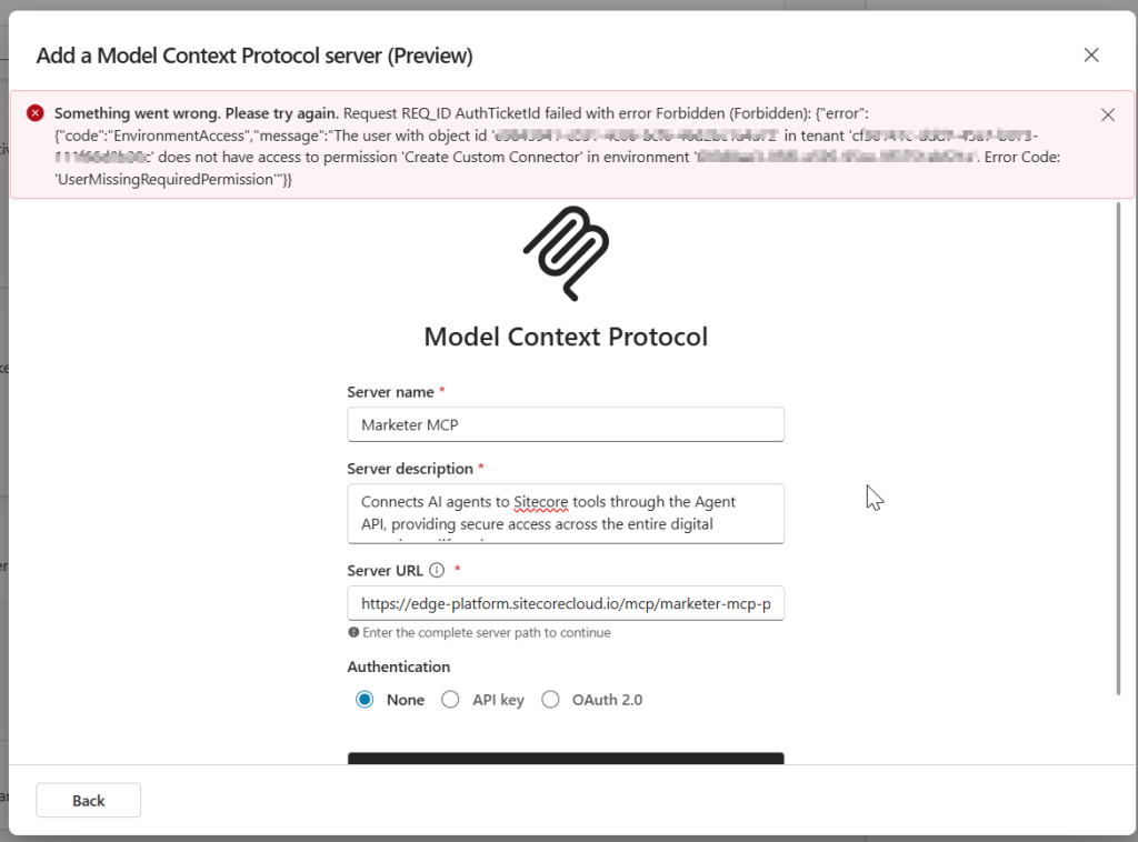 You may come across some issues when establishing the connectivity into Marketer MCP from Copilot Studio. Below are the issues I encountered and how I resolved them.