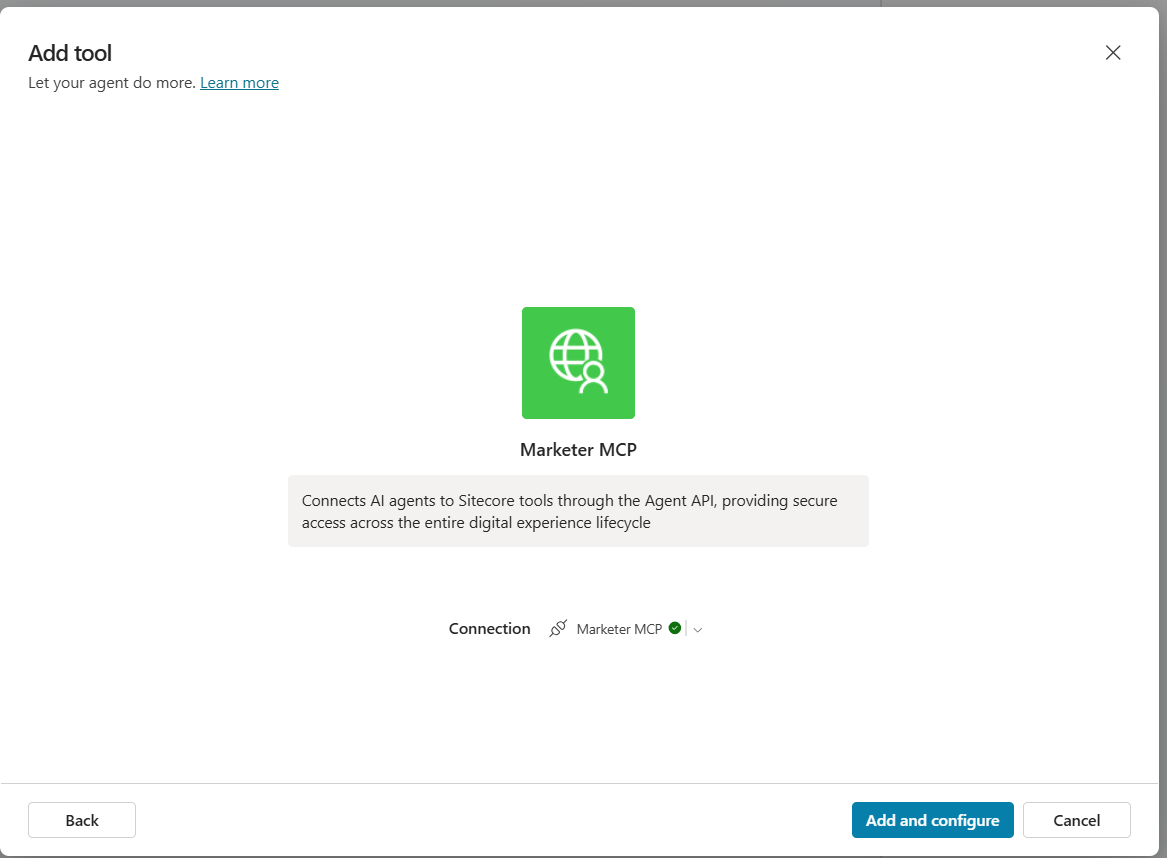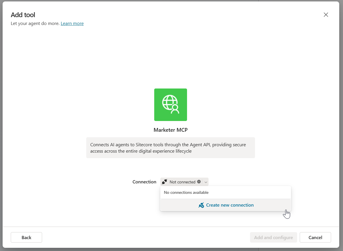 • Return to the Add tool dialog in Copilot Studio. When it shows that you’re connected to the MCP server, click Add and configure.