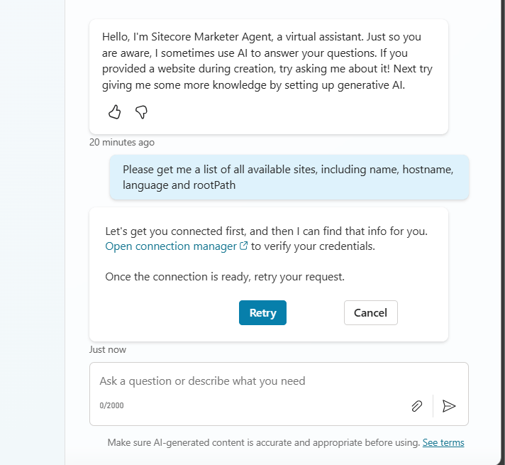 From your Copilot prompt text area, you can now use natural language to prompt and perform actions in SitecoreAI. The first time you write a prompt, you may see a connection warning message shown below.