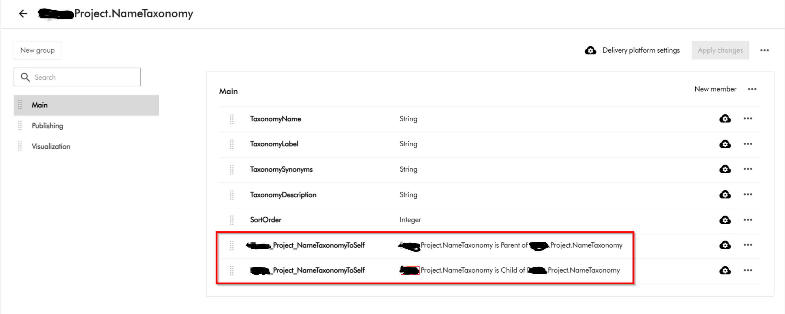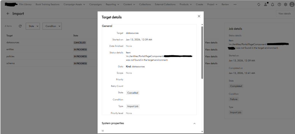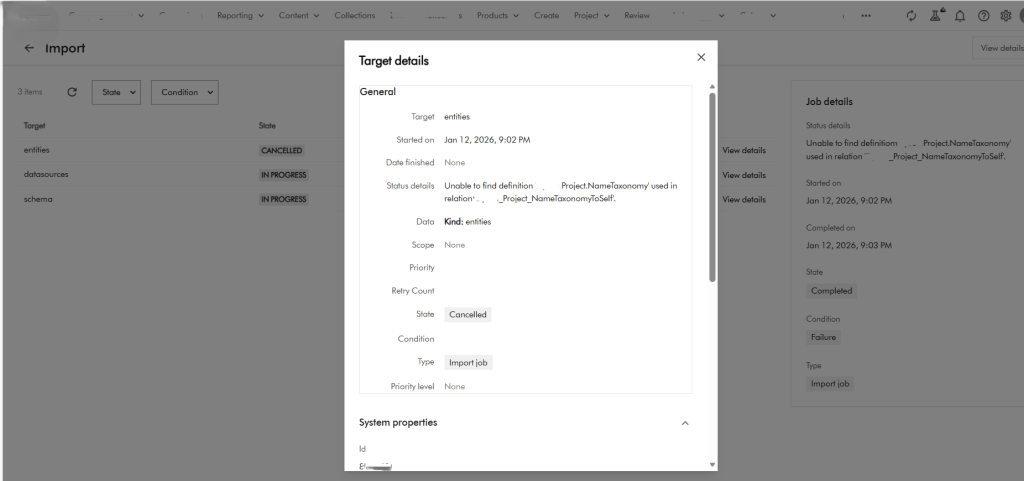 Raw Output: xxxx Details Unable to find definition 'XXXX.Project.NameTaxonomy' used in relation 'XXXX_Project_NameTaxonomyToSelf'. filename: entities.zip import_type: Package import_dry_run_feature: True Targets Target: entities Status details: Unable to find definition 'XXXX.Project.NameTaxonomy' used in relation 'XXXX_Project_NameTaxonomyToSelf'. Kind: entities Target: datasources Status details: Kind: datasources Target: schema Status details: Kind: schema