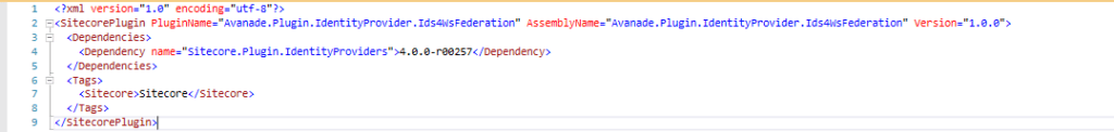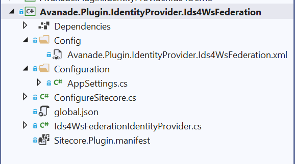 The Sitecore Identity Server Plugin requires an XML based configuration based on Sitecore Identity Server template as shown below. In your Visual Studio project, create a solution folder named “Config“. Then add an XML file using the naming convention {Plugin_name}.xml where {Plugin_name} is the name of this project. So in our case, we will name it Avanade.Plugin.IdentityProvider.Ids4WsFederation.xml