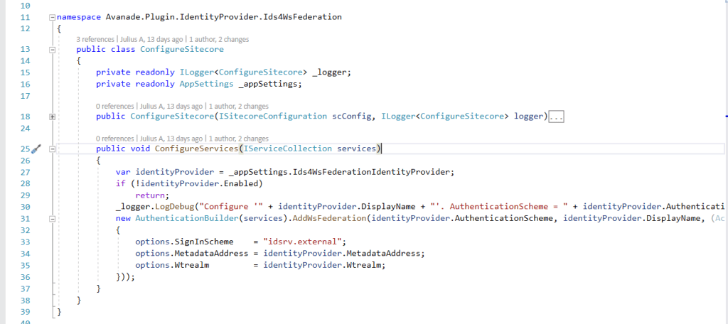 Notice how we use AuthenticationBuilder(services).AddWsFederation() pipeline below, which is available to us via the Microsoft.AspNetCore.Authentication.WsFederation package we referenced earlier.