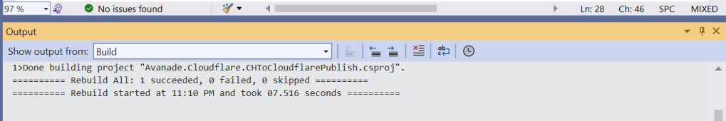 Your Visual Studio Output window will show Rebuild All succeeded message, similar to the one below.