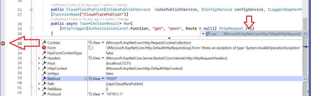 Below you can see my Breakpoint on line 32, where I am inspecting debug-level details of my POST request.
