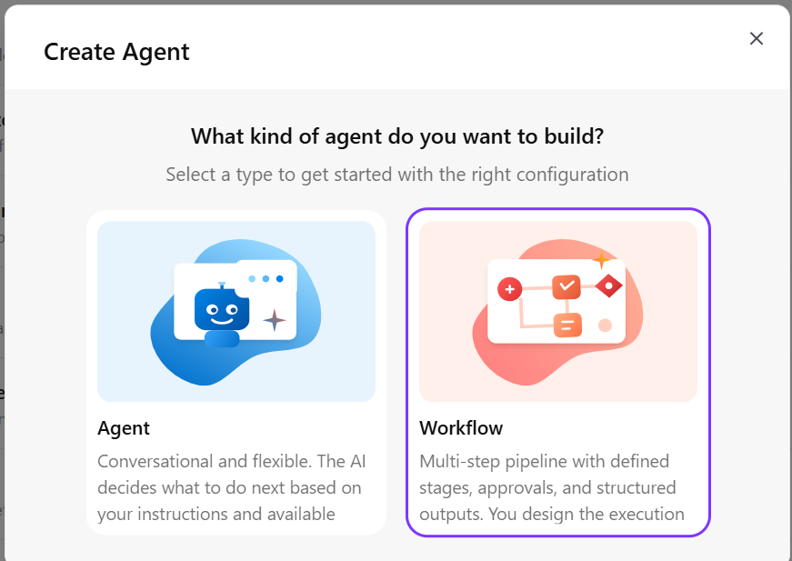 - Create standard agents – define standard agents with instructions, tools, skills, context, and output formats for a flexible, chat-style experience.