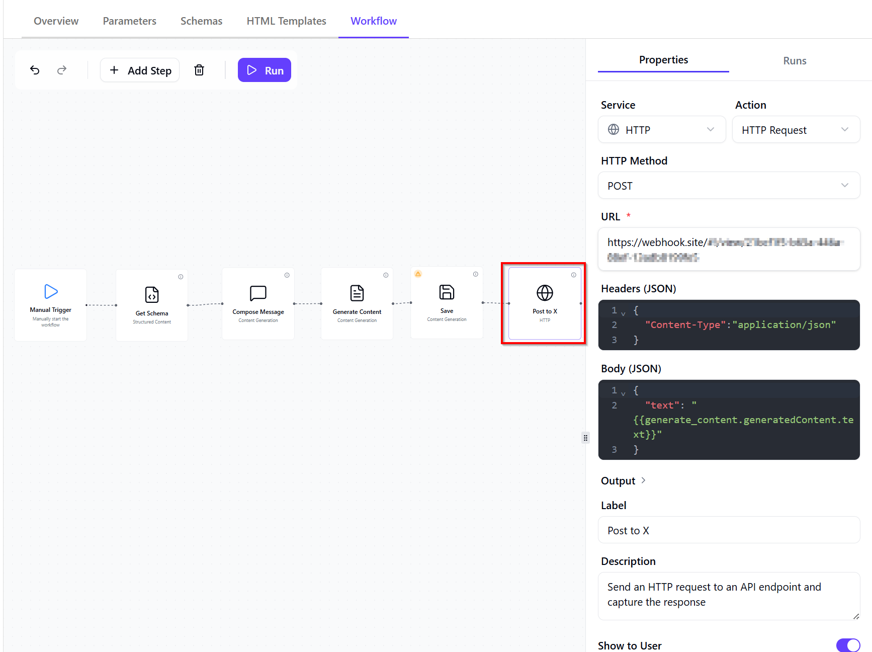 An HTTP Request action is used to send generated content to an external endpoint. In our case, to push the Tweet to Twitter/X.