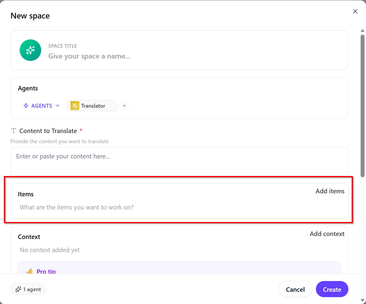 Items are the inputs the agent acts on. The agent processes each item and generates outputs for it. Use items to define what the agent should process individually. This enables the agent to perform actions on specific content from SitecoreAI.