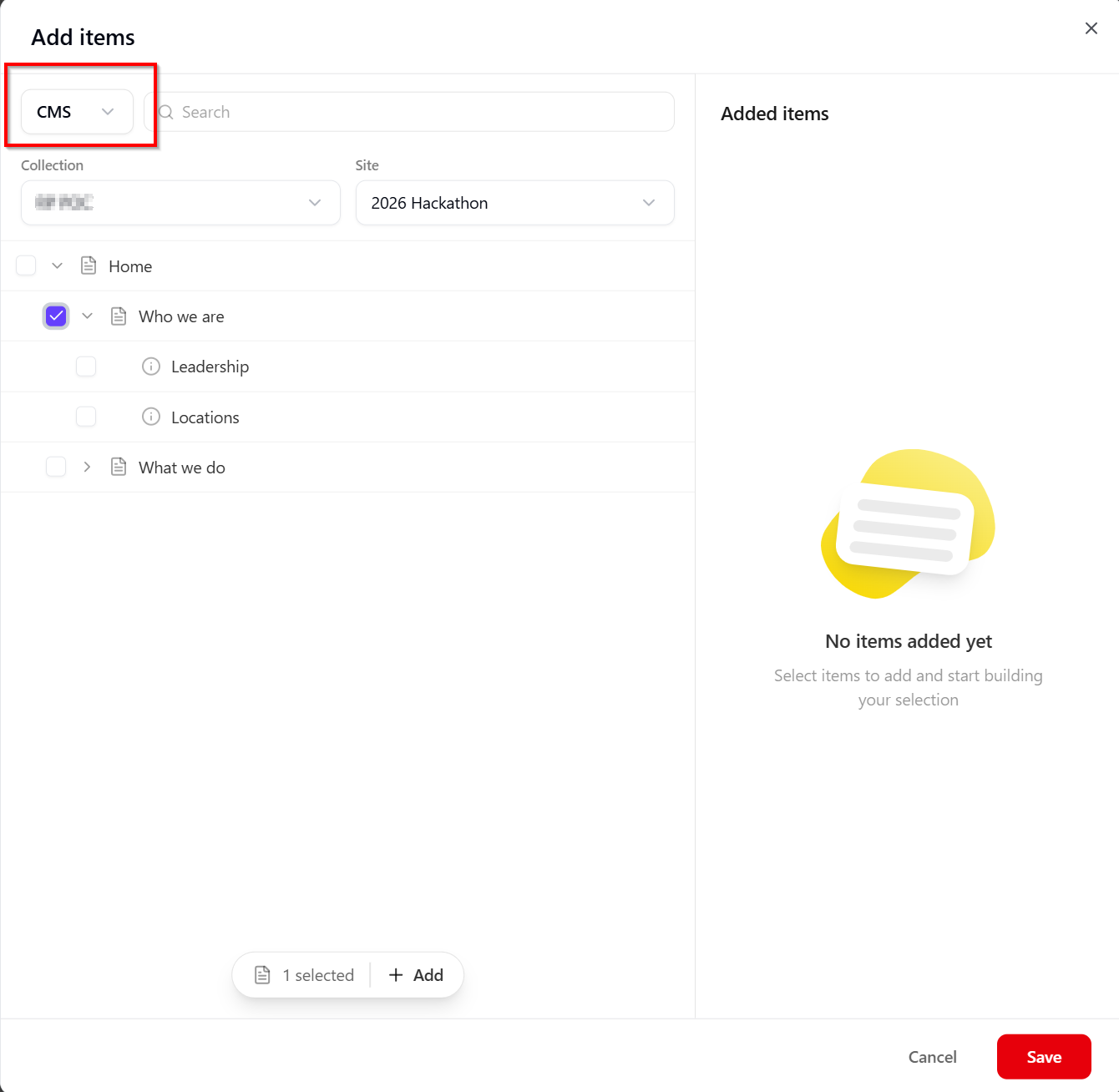 Clicking on Add items will allow to select SitecoreAI CMS content items, as shown below